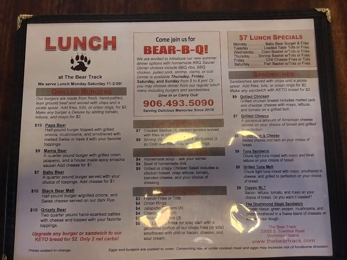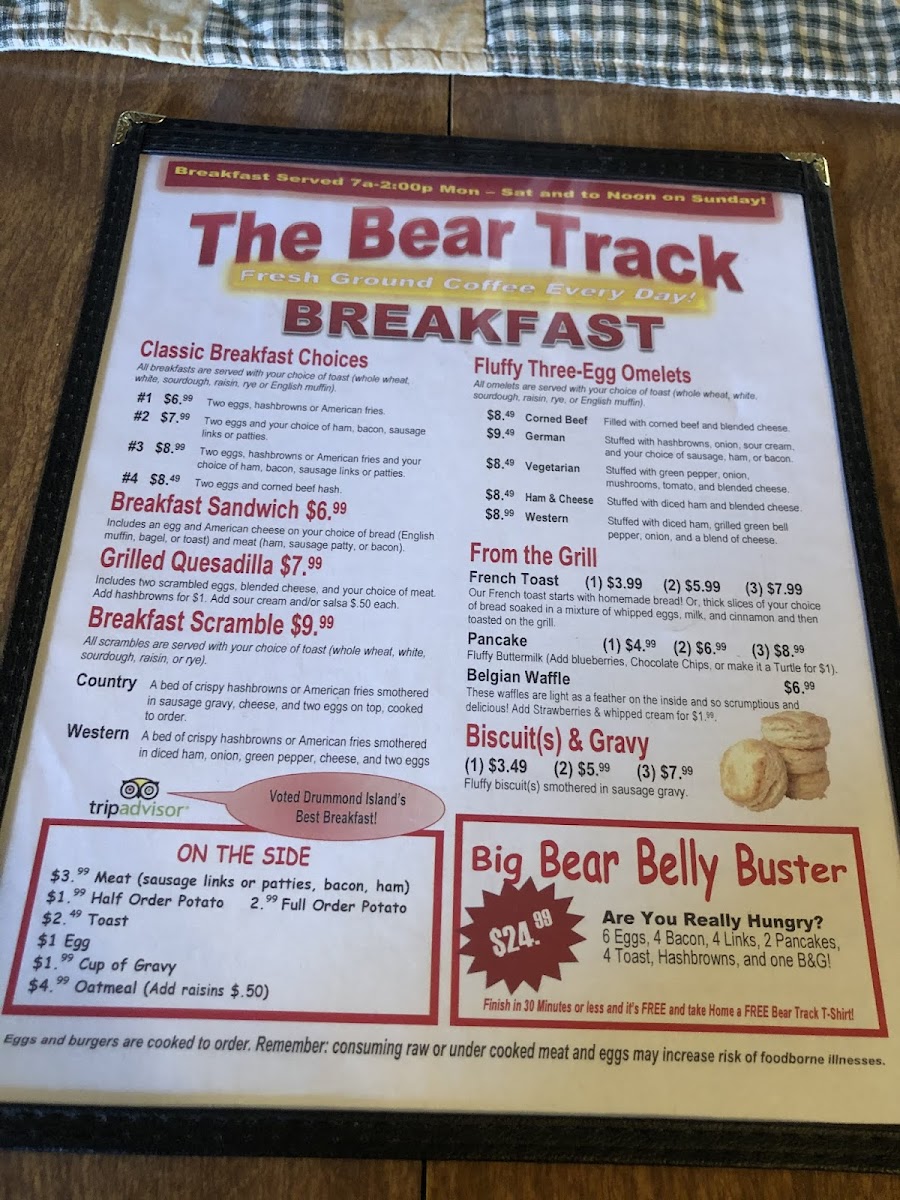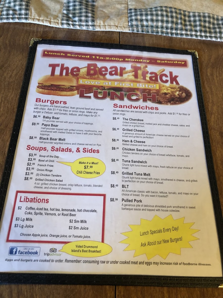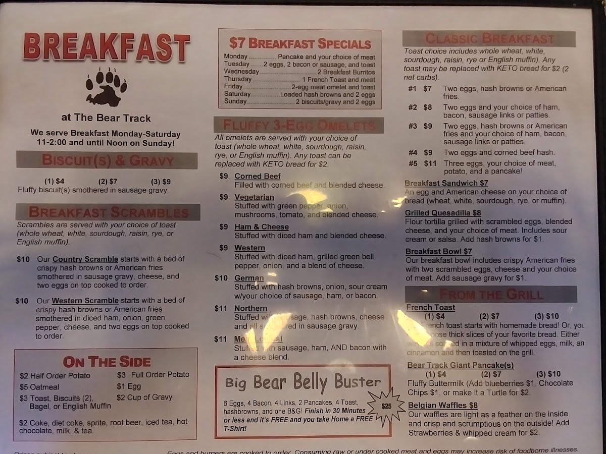 Overall, The Bear Track’s menu provides a wide array of delicious choices at reasonable prices, ensuring that there’s something for everyone. Whether you're in the mood for a hearty breakfast or a filling lunch, this restaurant has you covered.